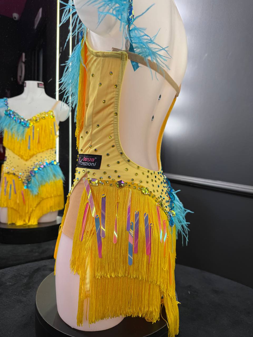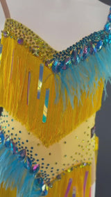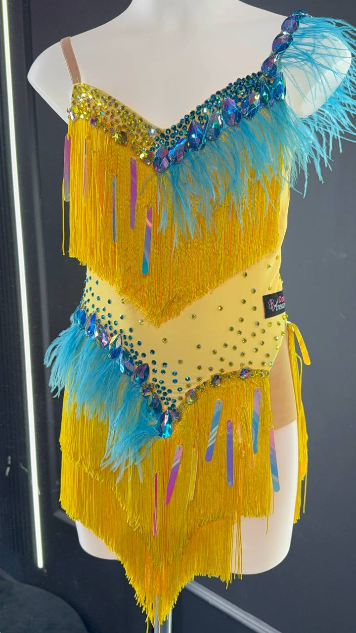 Arricchisci il tuo guardaroba da ballo con il fantastico abito Yellow Fantasy! Con dettagli in frange, strass e piume, questo abito ti farà brillare su tutte le piste da ballo latino americane. Perfetto per balli di classe A, aggiungerà un tocco di eleganza e stile al tuo look!
